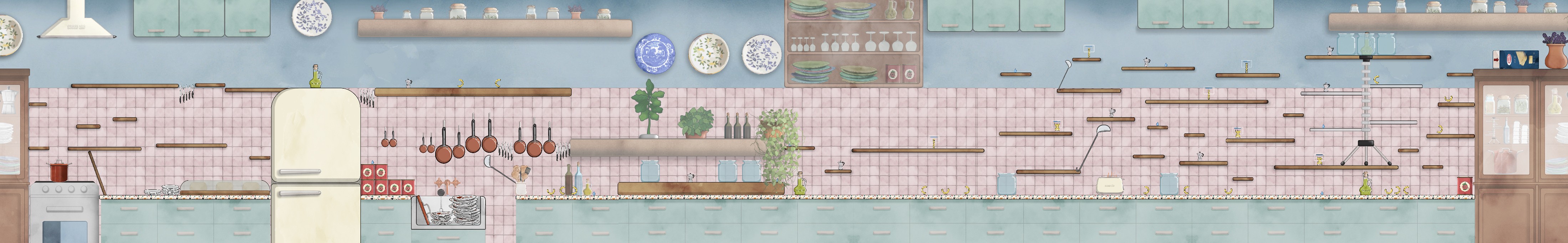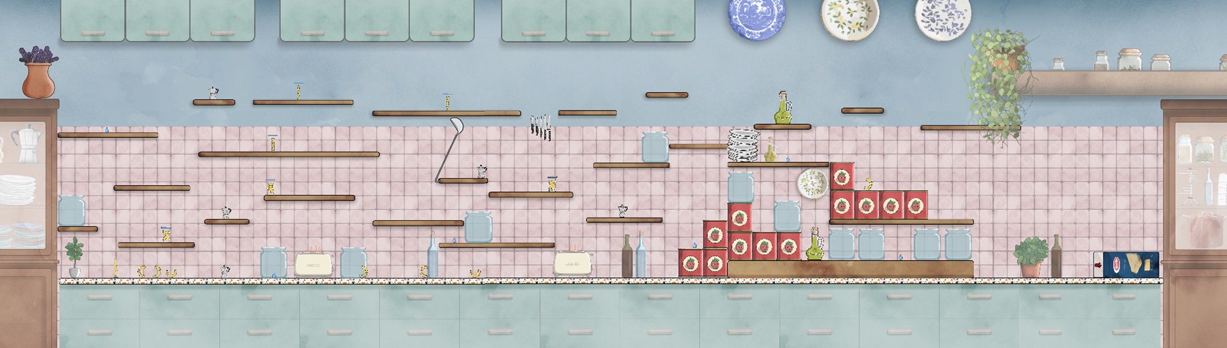 This project blends platforming and ragdoll physics within a vintage Italian kitchen, the world draws from 1930s cartoons and Art Deco environments. Influences from Cuphead and Fleischer Studios guide exaggerated characters, playful interactions, and pastel-toned aesthetics.